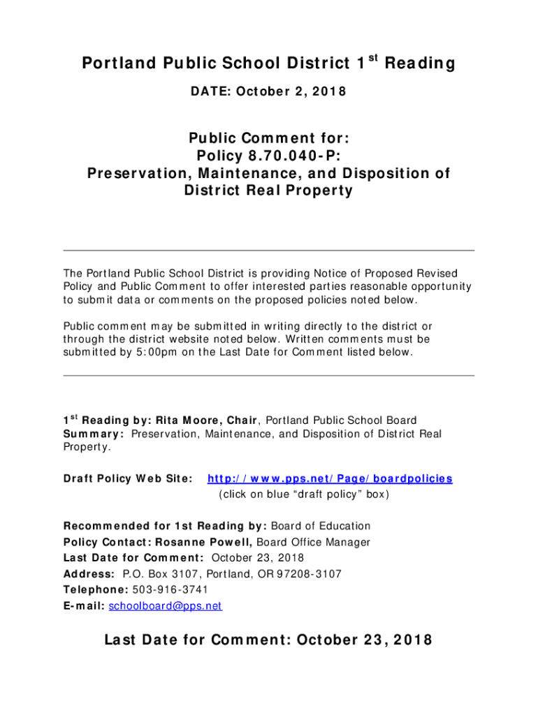 Portland Public School District 1st Reading DATE: October 2, 2018Public Comment for: Policy 8.70.040P: Preservation, Maintenance, and Disposition of District Real Property Portland Public School District