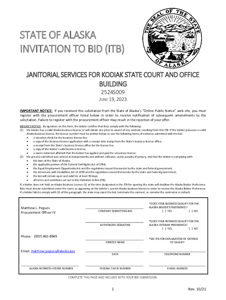 STATE OF ALASKA INVITATION TO BID (ITB) JANITORIAL SERVICES FOR KODIAK STATE COURT AND OFFICE BUILDING 2524S009 JUNE 19, 2023, IMPORTANT NOTICE: If you received this solicitation from the State of