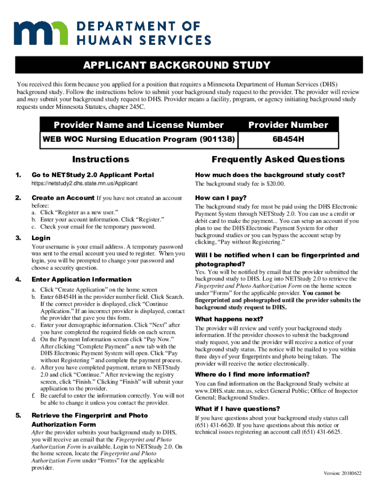 APPLICANT BACKGROUND STUDY You received this form because you applied for a position that requires a Minnesota Department of Human Services (DHS) background study. Follow the instructions below to