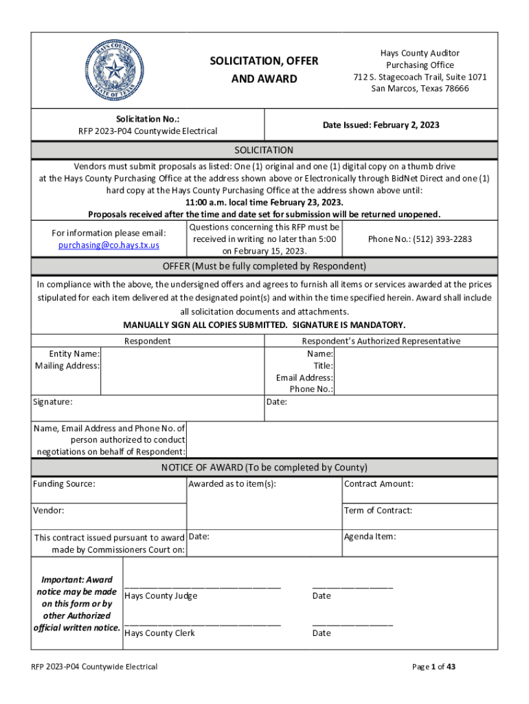 SOLICITATION, OFFER AND AWARD Solicitation No.: RFP 2023P04 Countywide Electrical Hays County Auditor Purchasing Office 712 S. Stagecoach Trail, Suite 1071 San Marcos, Texas 78666 Date Issued: February