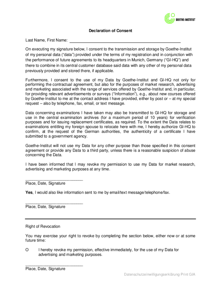 Declaration of Consent Last Name, First Name: On executing my signature below, I consent to the transmission and storage by GoetheInstitut of my personal data (data) provided under the terms of my