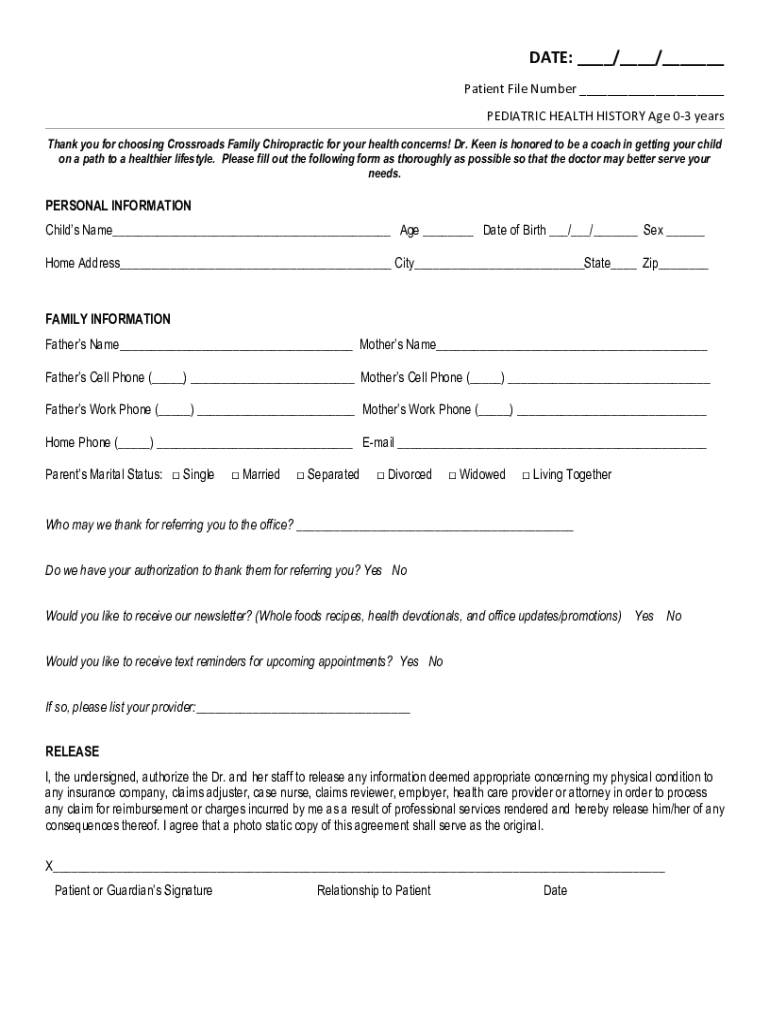 DATE: ___/___/___ Patient File Number ___ PEDIATRIC HEALTH HISTORY Age 03 years Thank you for choosing Crossroads Family Chiropractic for your health concerns! Dr. Keen is honored to be a coach in