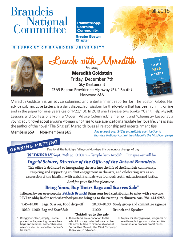 Fall 2018Lunch with Meredith Featuring Meredith Goldstein Friday, December 7th Sky Restaurant 1369 Boston Providence Highway (Rt. 1 South) Norwood MA Meredith Goldstein is an advice columnist and