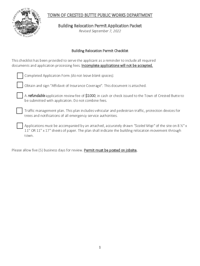 TOWN OF CRESTED BUTTE PUBLIC WORKS DEPARTMENT Building Relocation Permit Application Packet Revised September 7, 2022Building Relocation Permit Checklist This checklist has been provided to serve