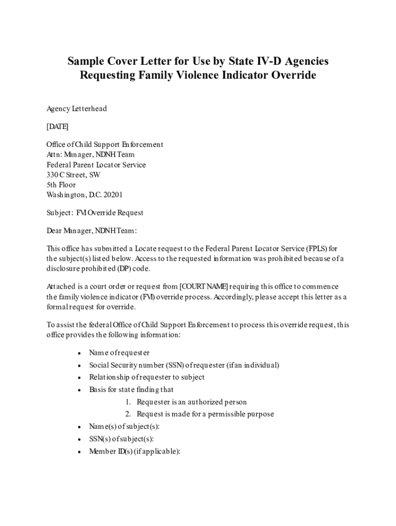 Sample Cover Letter for Use by State IVD Agencies Requesting Family Violence Indicator Override Agency Letterhead [DATE] Office of Child Support Enforcement Attn: Manager, NDH Team Federal Parent