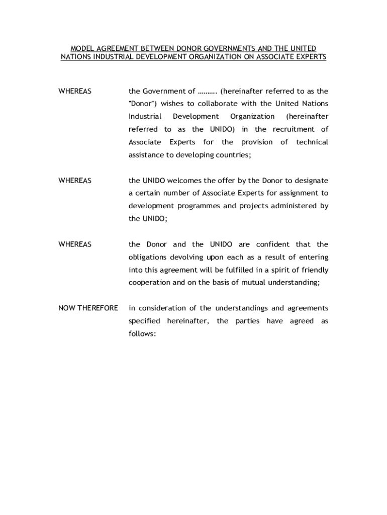 MODEL AGREEMENT BETWEEN DONOR GOVERNMENTS AND THE UNITED NATIONS INDUSTRIAL DEVELOPMENT ORGANIZATION ON ASSOCIATE EXPERTSWHEREASthe Government of. (hereinafter referred to as the \”Donor\”) wishes
