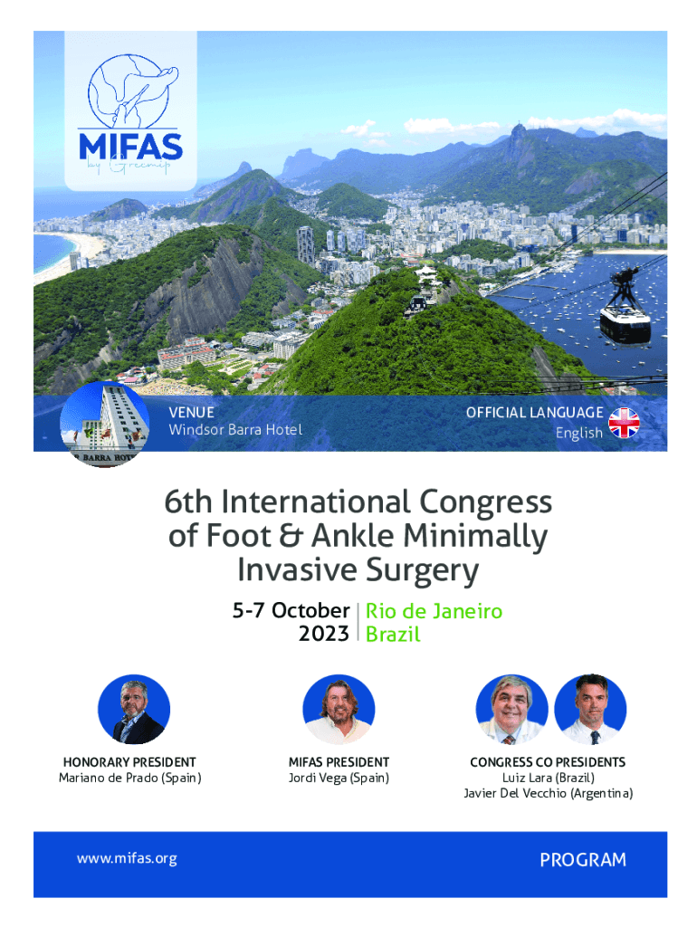VENUE Windsor Barry HotelOFFICIAL LANGUAGE English6th International Congress of Foot & Ankle Minimally Invasive Surgery 57 October Rio de Janeiro 2023 BrazilHONORARY PRESIDENT Mariano de Prado (Spain)www.mifas.orgMIFAS2023_program_v2.indd