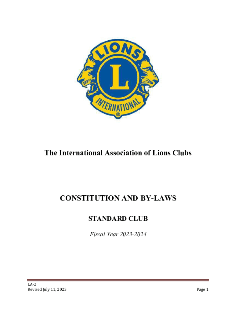 The International Association of Lions ClubsCONSTITUTION AND BYLAWS STANDARD CLUB Fiscal Year 20232024LA2 Revised July 11, 2023Page 1Lions Clubs International PURPOSES TO ORGANIZE, charter and supervise