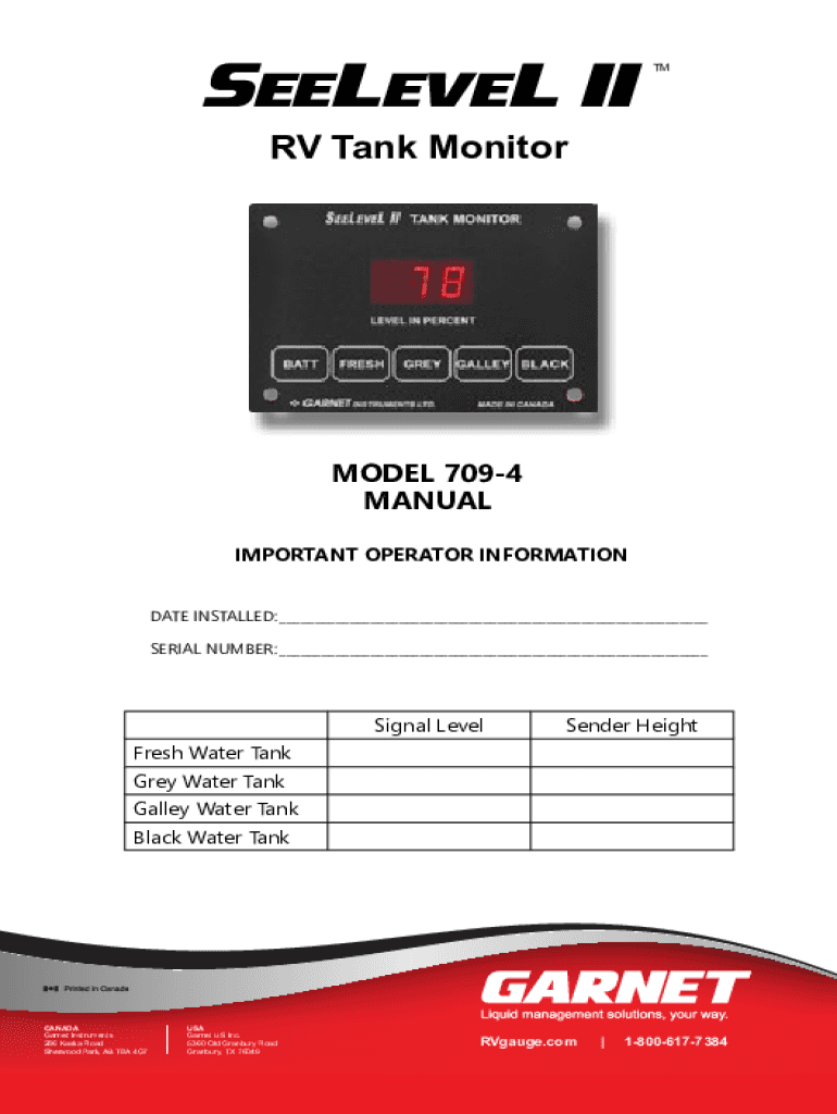SUBLEVEL INTER Tank MonitorMODEL 7094 MANUAL IMPORTANT OPERATOR INFORMATION DATE INSTALLED:___ SERIAL NUMBER:___Fresh Water TankSignal Levelheaded Height Grey Water TankGalley Water Tailback Water
