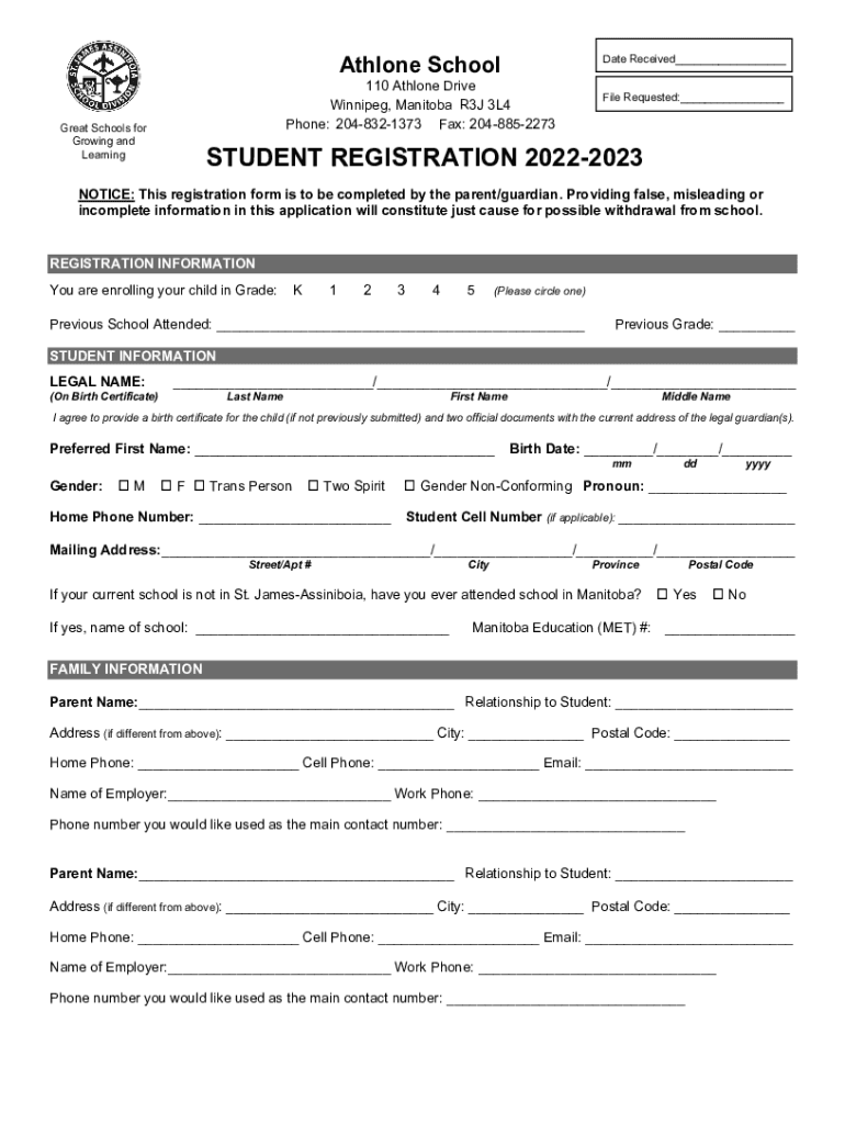 LearningFile Requested:___STUDENT REGISTRATION 20222023NOTICE: