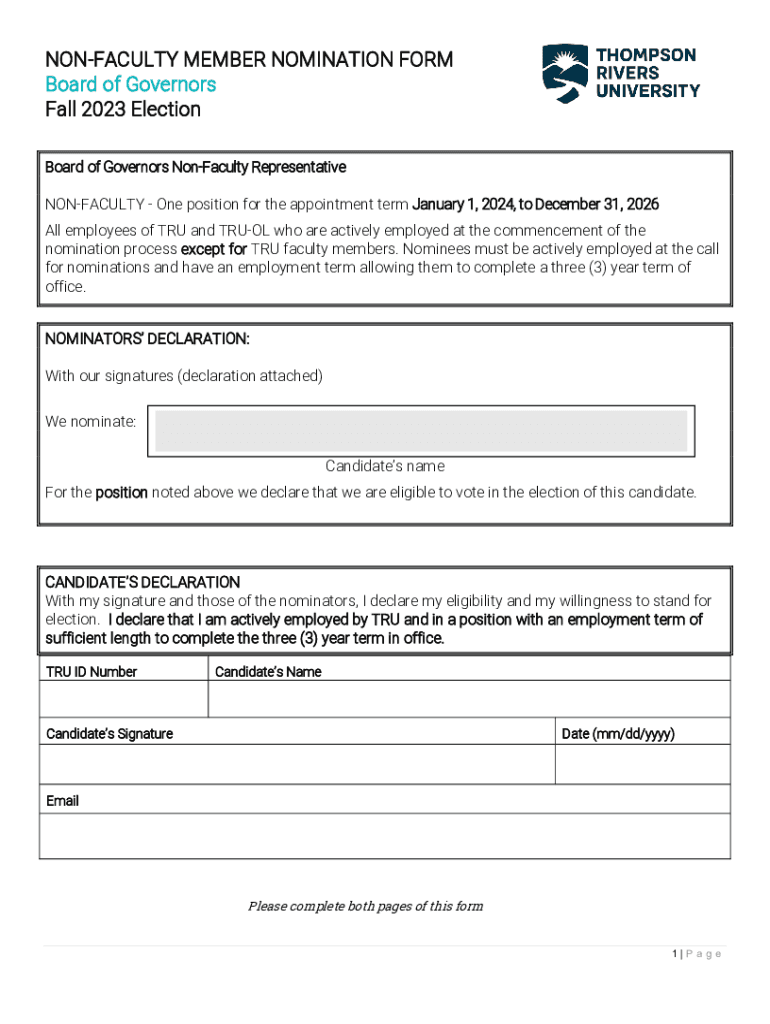 FACULTY MEMBER NOMINATION FORM Board of Governors Fall 2023 Election Board of Governors Faculty Representative FACULTY One position for the appointment term January 1, 2024, to December 31, 2026,