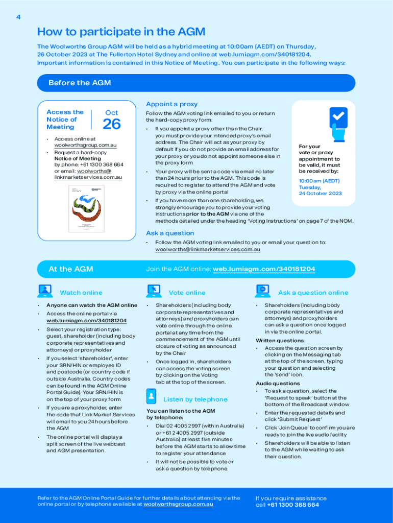 4How to participate in the AGM The Woolworths Group AGM will be held as a hybrid meeting at 10:00am (ADT) on Thursday, 26October2023 at The Fullerton Hotel Sydney and online at web.lumiagm.com/340181204.