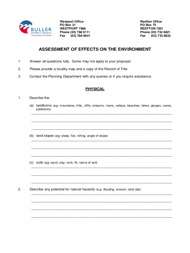 Westport Office PO Box 21 WESTPORT 7866 Phone (03) 788 9111 Fax (03) 788 8041Reefton Office PO Box 75 BEETON 7851 Phone (03) 732 8821 Fax (03) 732 8822ASSESSMENT OF EFFECTS ON THE ENVIRONMENT 1. Answer