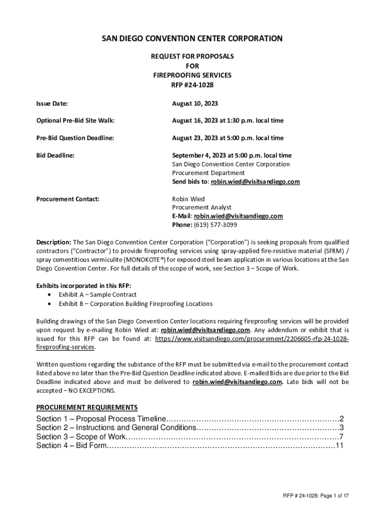SAN DIEGO CONVENTION CENTER CORPORATION REQUEST FOR PROPOSALS FOR FIREPROOFING SERVICES RFP #241028 Issue Date:August 10, 2023Optional PreBid Site Walk:August 16, 2023, at 1:30 p.m. local timePreBid