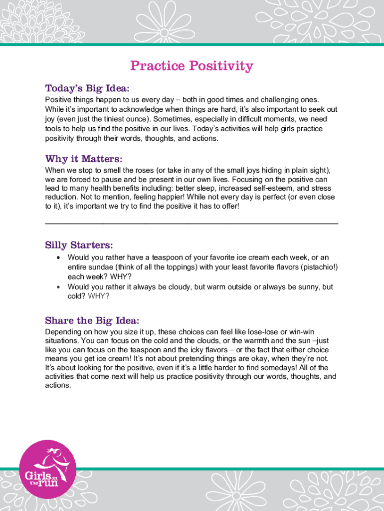 Practice Positivity Today's Big Idea: Positive things happen to us every day both in good times and challenging ones. While it's important to acknowledge when things are hard, it's also important