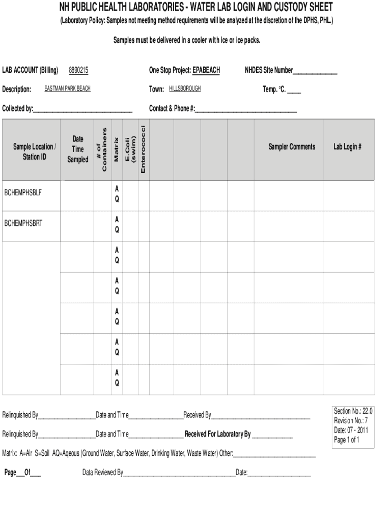 Get the free NH PUBLIC HEALTH LABORATORIES - WATER LAB LOGIN AND CUSTODY SHEET
