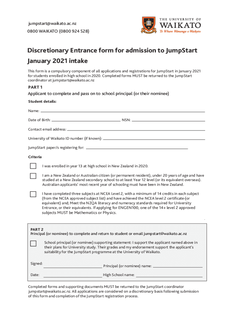 Jumpstart@waikato.ac.nz 0800 MANKATO (0800 924 528)Discretionary Entrance form for admission to JumpStart January 2021 intake This form is a compulsory component of all applications and registrations