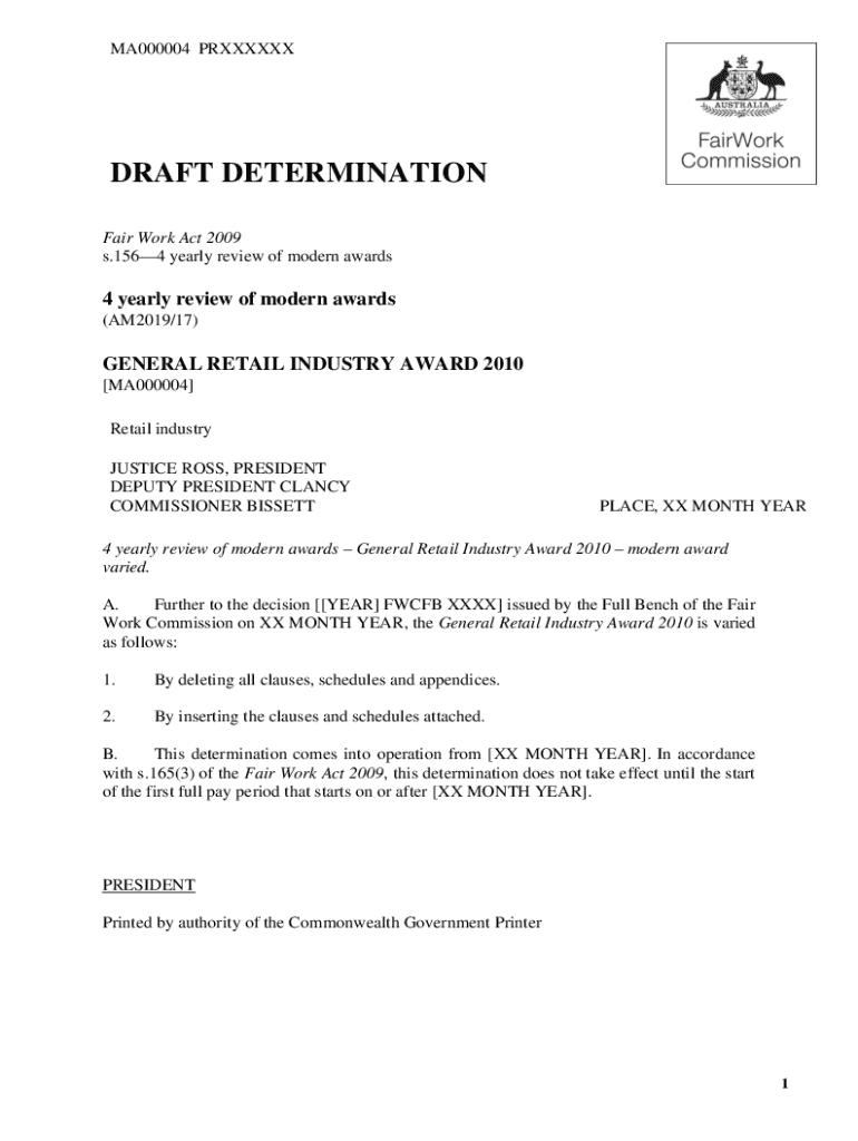 MA000004 PRXXXXXXDRAFT DETERMINATION Fair Work Act 2009 s.1564 yearly review of modern awards4 yearly review of modern awards (AM2019/17)GENERAL RETAIL INDUSTRY AWARD 2010 [MA000004] Retail industry