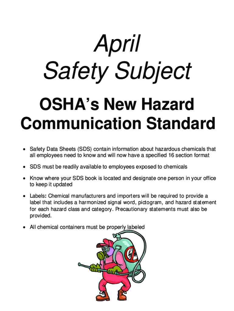 April Safety Subject OSHA's New Hazard Communication Standard Safety Data Sheets (SDS) contain information about hazardous chemicals that all employees need to know and will now have a specified 16