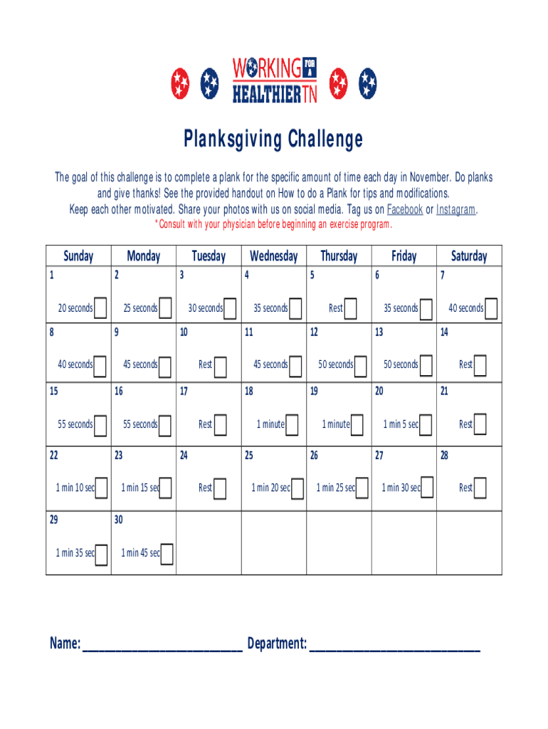 Planks giving Challenge The goal of this challenge is to complete a plank for the specific amount of time each day in November. Do planks and give thanks! See the provided handout on How to do a Plank