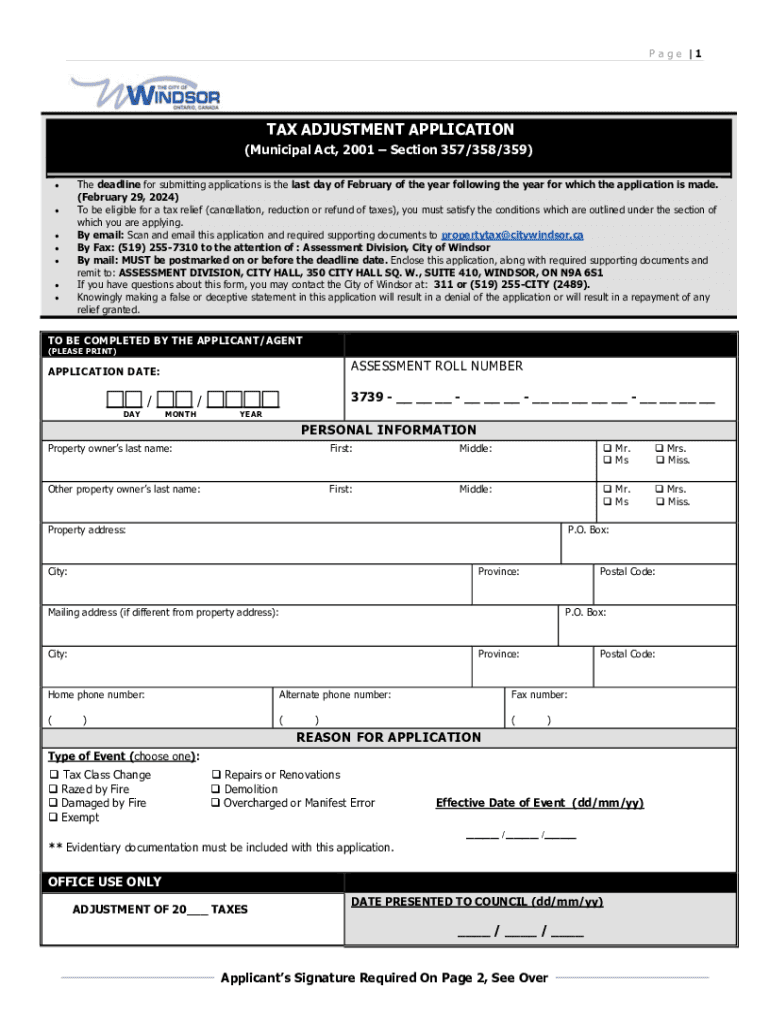 Page |1TAX ADJUSTMENT APPLICATION (Municipal Act, 2001 Section 357/358/359) The deadline for submitting applications is the last day of February of the year following the year for which the application