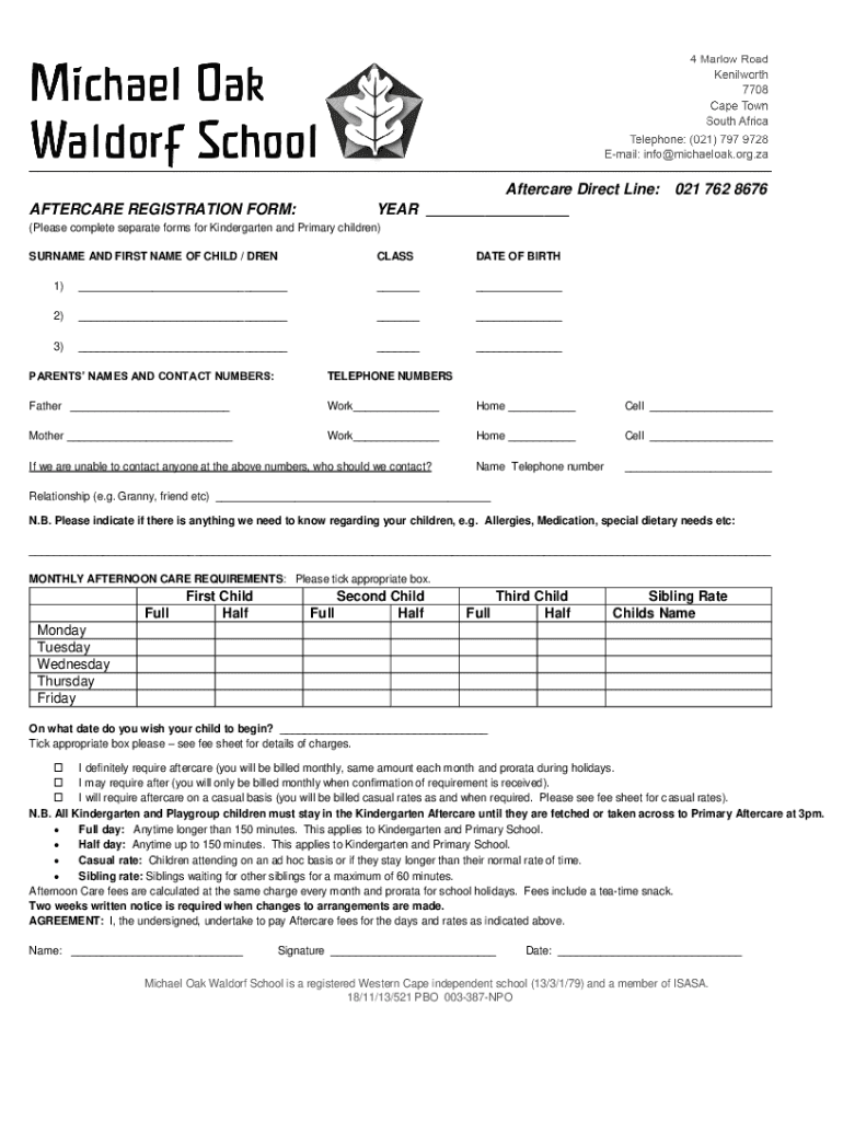 Aftercare Direct Line: 021 762 8676 YEAR ___AFTERCARE REGISTRATION FORM:(Please complete separate forms for Kindergarten and Primary children) SURNAME AND FIRST NAME OF CHILD / DRENCLASSDATE OF BIRTH1)_________2)_________3)_________PARENTS