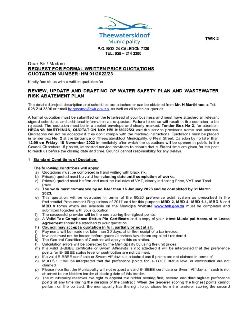 TWO 2P. O. BOX 24 CALEDON 7230 TEL: 028 214 3300 Dear Sir / Madam REQUEST FOR FORMAL WRITTEN PRICE QUOTATIONS QUOTATION NUMBER: HM 01/2022/23 Kindly furnish us with a written quotation for:REVIEW,