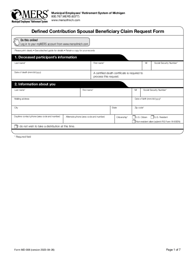 Municipal Employees Retirement System of Michigan 800.767.MERS (6377) www.mersofmich.comDefined Contribution Spousal Beneficiary Claim Request Form Do this online! Log in to your Myers account from