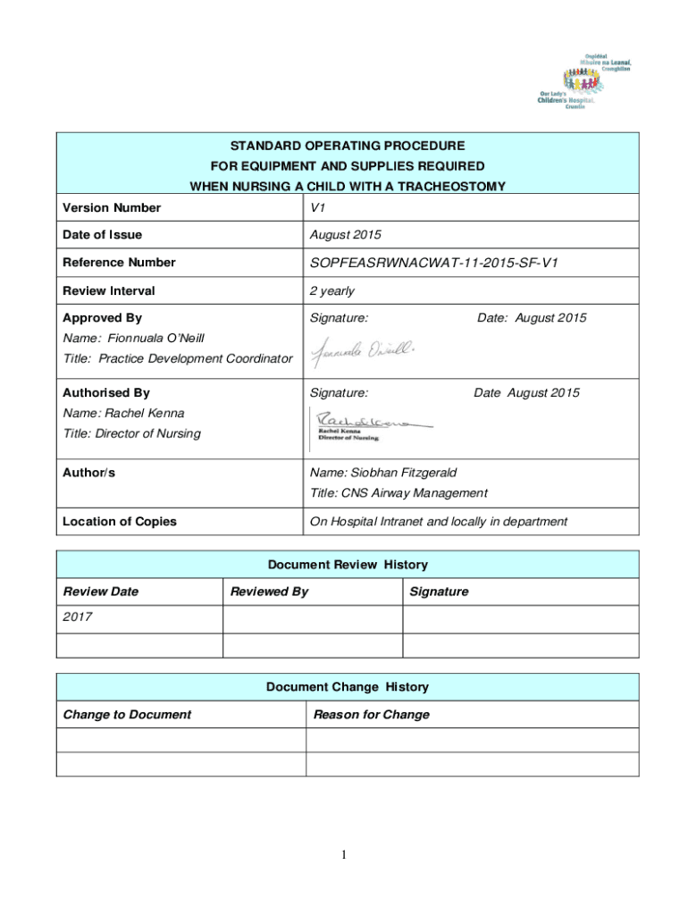 STANDARD OPERATING PROCEDURE FOR EQUIPMENT AND SUPPLIES REQUIRED WHEN NURSING A CHILD WITH A TRACHEOSTOMY Version NumberV1Date of Issue August 2015Reference NumberSOPFEASRWNACWAT112015SFV1Review Interval2