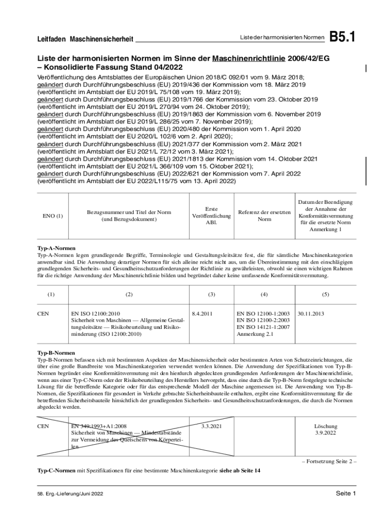 List her harmonisierten NormenLeitfaden MaschinensicherheitB5.1Liste her harmonisierten Norman I'm Since her Maschinenrichtlinie 2006/42/EG