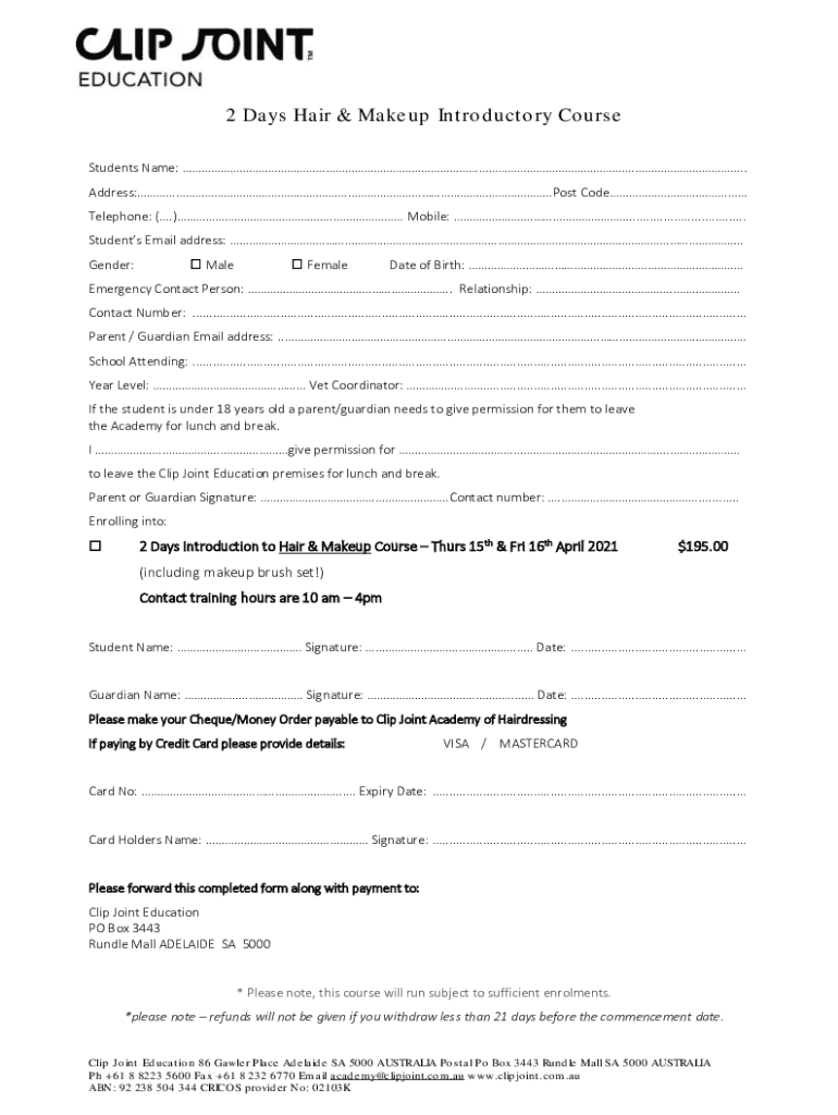 2 Days Hair & Make up Intro duct o Ry Course Students Name: ... Address:.... Post Code. Telephone: (.).
