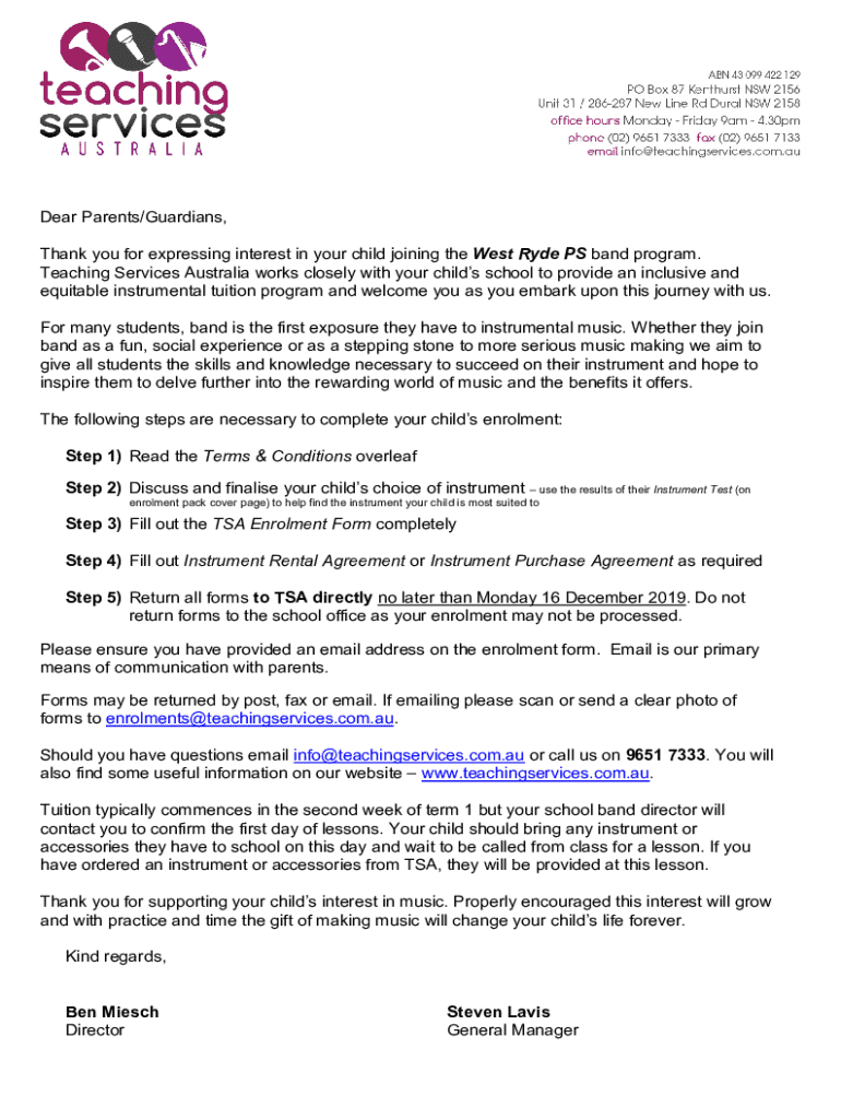 Dear Parents/Guardians, Thank you for expressing interest in your child joining the West Ride PS band program. Teaching Services Australia works closely with your children school to provide an inclusive