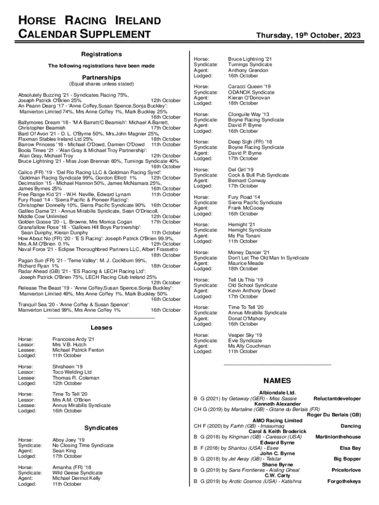 HORSE RACING IRELAND CALENDAR SUPPLEMENT Registrations The following registrations have been madePartnerships (Equal shares unless stated) Absolutely Buzzing \'21 Syndicates. Racing 75%, Joseph Patrick