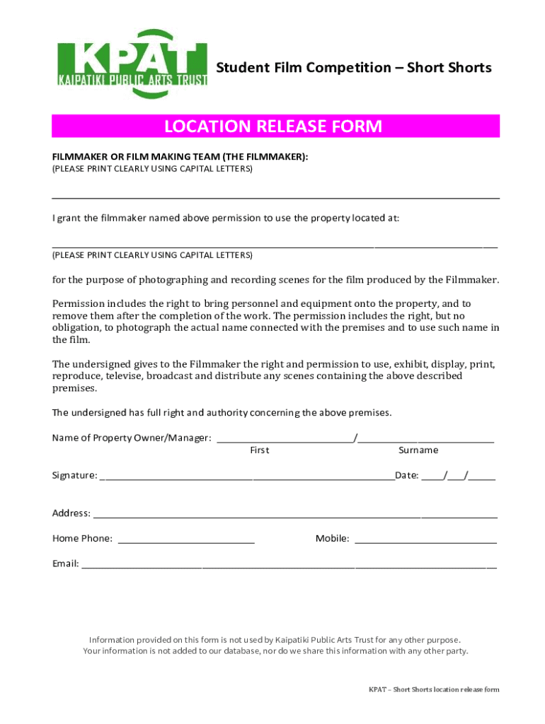 Student Film Competition Short ShortsLOCATION RELEASE FORM FILMMAKER OR FILM MAKING TEAM (THE FILMMAKER): (PLEASE PRINT CLEARLY USING CAPITAL LETTERS)I grant the filmmaker named above permission to
