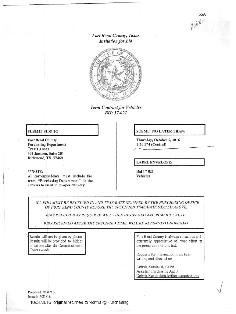 35AFort Bend County, Texas Invitation for Midterm Contract/or Vehicles BID 17021ISUBMIT Beds TO:Fort Bend (::county Purchasing.j Department Travis Anna 301 Jackson, Suite 201 Richmond, fix 77469**NOTE: