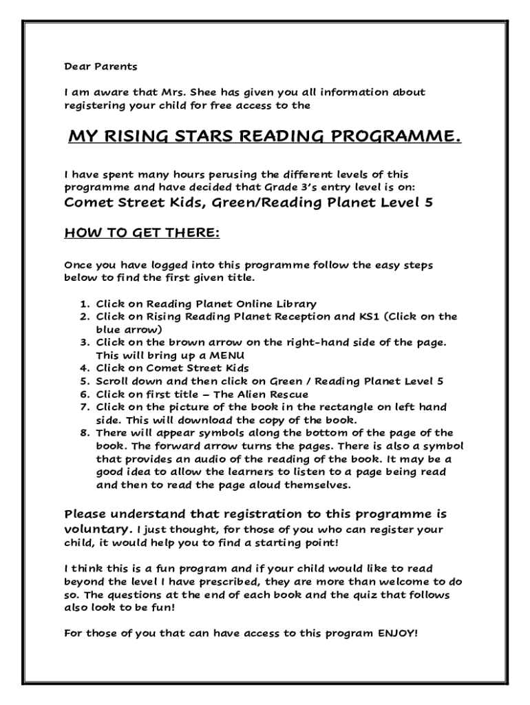 Dear Parents I am aware that Mrs. She has given you all information about registering your child for free access to they're RISING STARS READING Program. I have spent many hours perusing the different