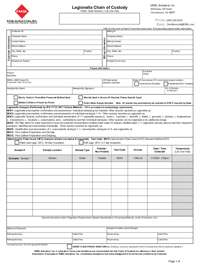 EMIL Analytical, Inc. Regionally Chain of Custody200 Route 130 North Cinnamon, NJ 08077EMSL Order Number / Lab Use Telephone: (800) 2203675 EMAIL: CinnMicroLab@EMSL.com Billing ID:Company Name:Company
