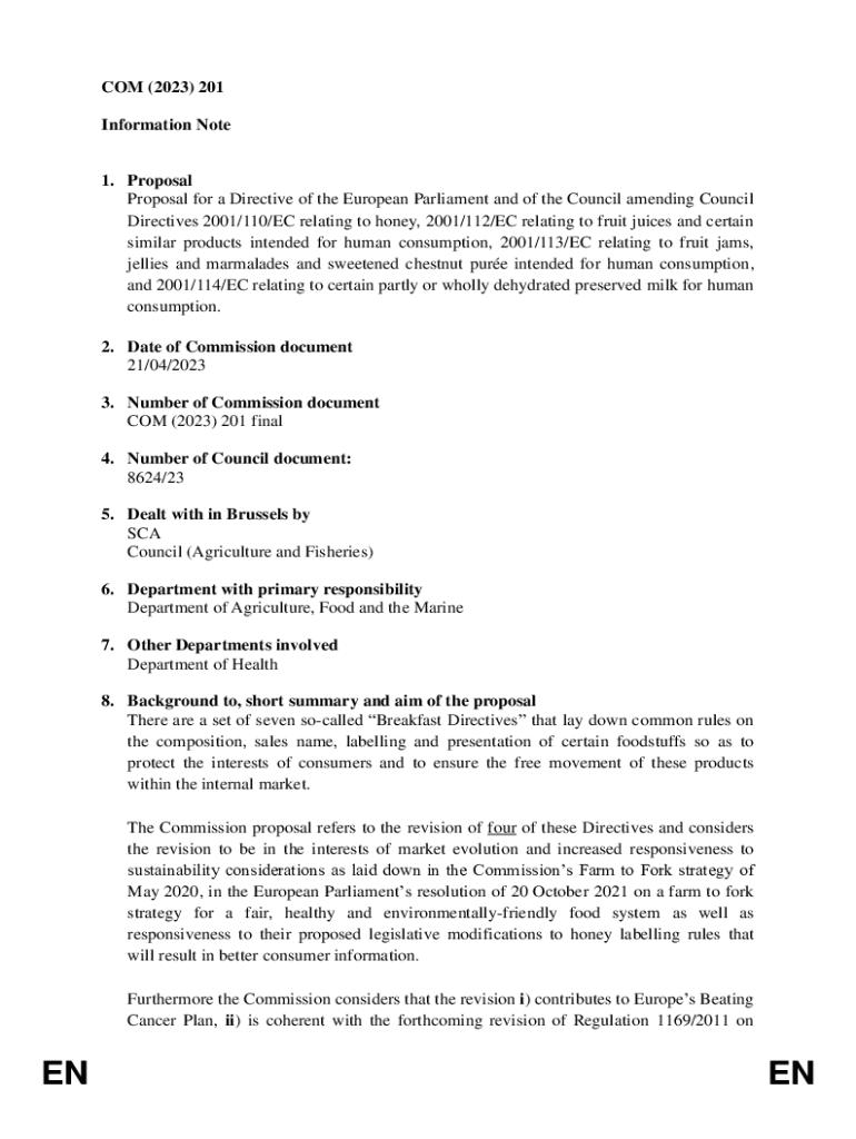 COM (2023) 201 Information Note1. Proposal for a Directive of the European Parliament and of the Council amending Council Directives 2001/110/EC relating to honey, 2001/112/EC relating to fruit juices
