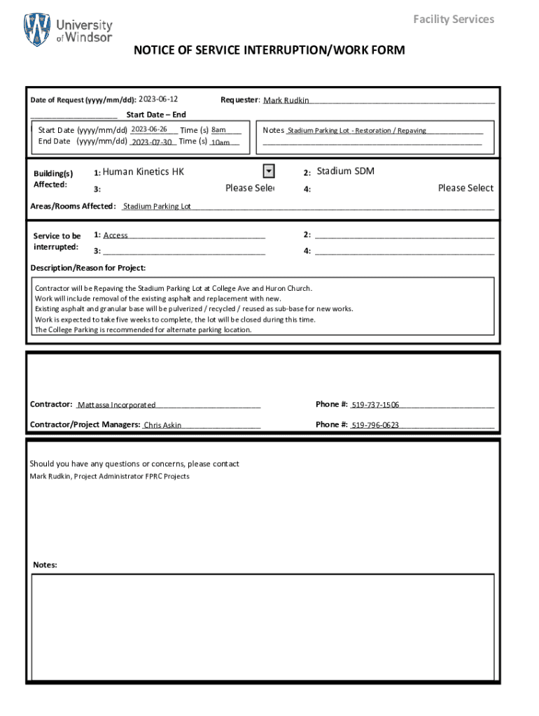 Facility ServicesNOTICE OF SERVICE INTERRUPTION/WORK Format of Request (YYY/mm/dd): 20230612___Requester: ___ Mark RudkinStart Date Endgame date Interruption/Closure 20230626 8am Start (YYY/mm/dd)