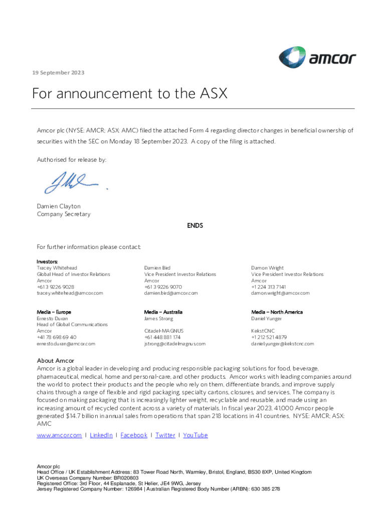 19 September 2023For announcement to the ASX Am cor plc (NYSE: AMUR; ASX: AMC) filed the attached Form 4 regarding director changes in beneficial ownership of securities with the SEC on Monday 18