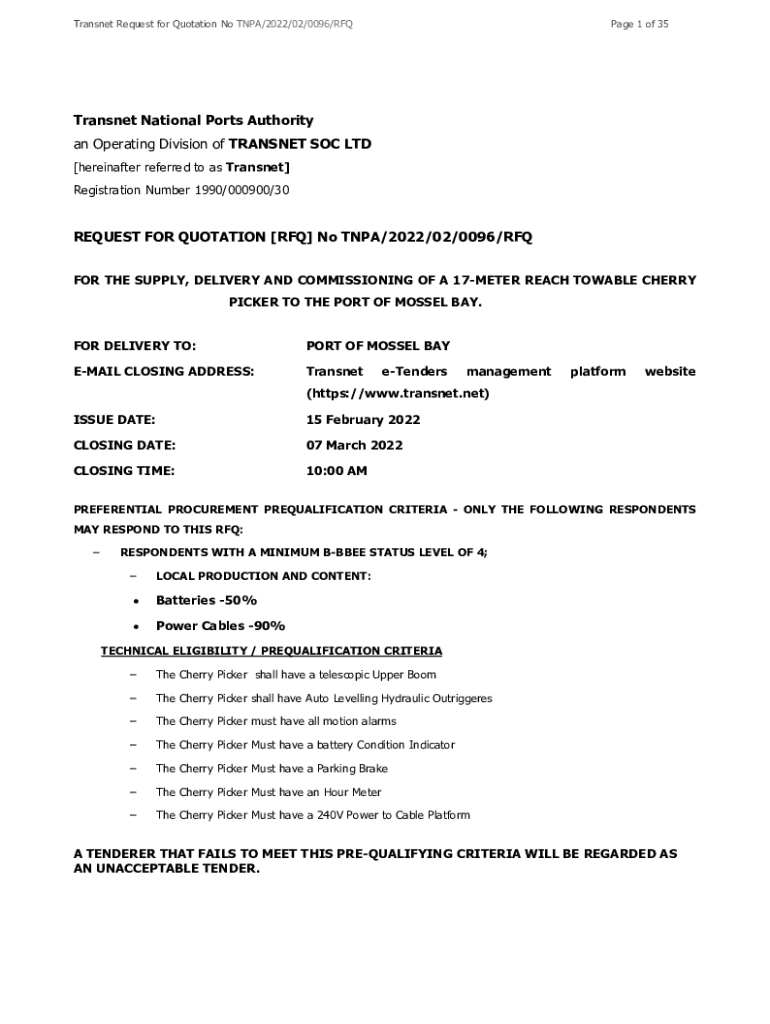 Transnet Request for Quotation No TNA/2022/02/0096/Rampage 1 of 35Transnet National Ports Authority an Operating Division of TRANSFER SOC LTD [hereinafter referred to as Transnet] Registration Number
