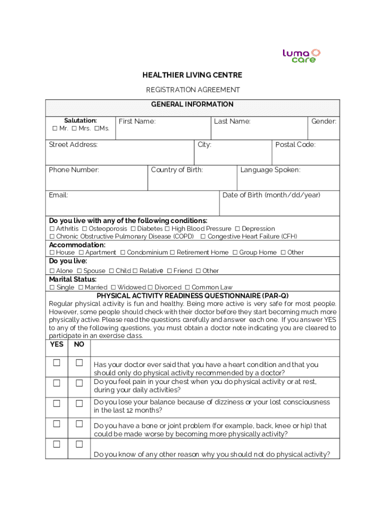 HEALTHIER LIVING Center REGISTRATION AGREEMENT GENERAL INFORMATION Salutation: Mr. Mrs. Ms. Street Address: Phone Number:First Name:Last Name: City:Postal Code:Country of Birth:Email:Gender:Language