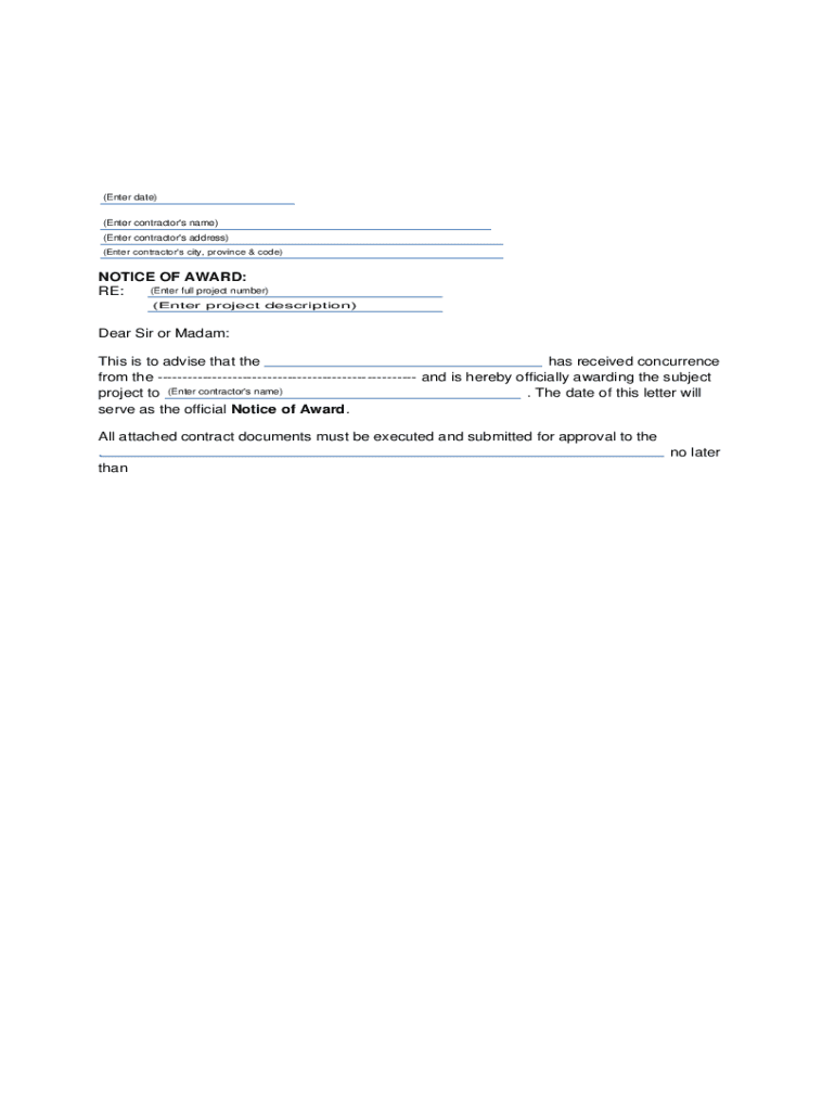 Get the free NOTICE OF AWARD: RE: Dear Sir or Madam