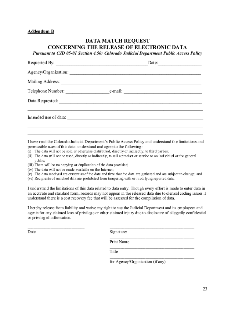Addendum DATA MATCH REQUEST CONCERNING THE RELEASE OF ELECTRONIC DATA Pursuant to CD 0501 Section 4.50: Colorado Judicial Department Public Access Policy Requested By: ___Date:___ Agency/Organization: