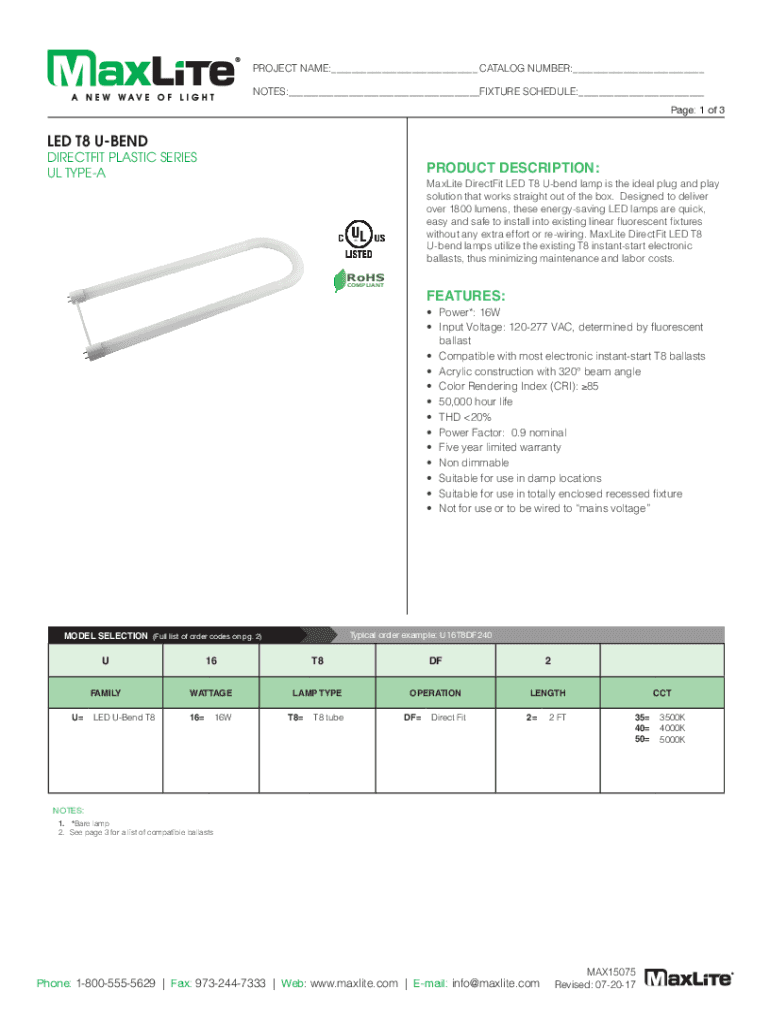 PROJECT NAME:___ CATALOG NUMBER:___ NOTES:___FIXTURE SCHEDULE:___ Page: 1 of 3LED T8 UBENDDIRECTFIT PLASTIC SERIES UL TYPEAPRODUCT DESCRIPTION: Malice The Directest LED T8 Bend lamp is the ideal plug