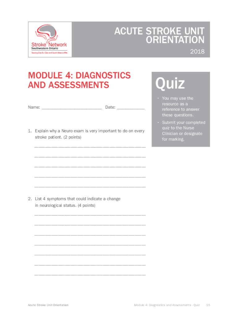 ACUTE STROKE UNIT ORIENTATION 2018MODULE 4: DIAGNOSTICS AND ASSESSMENTSQuizName:___Date:___1. Explain why a Euro exam is very important to do on every stroke patient. (2 points)_______________You
