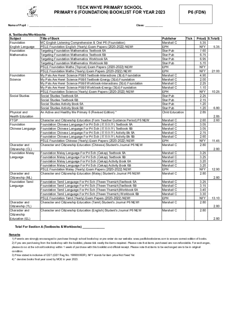 DECK WHY PRIMARY SCHOOL PRIMARY 6 (FOUNDATION) BOOKLET FOR YEAR 2023 Name of Pupil : ___P6 (FAN)Class: ___A. Textbooks/Workbooks Subject Title of Book Foundation MC English Listening Comprehension