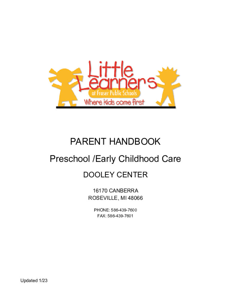 PARENT HANDBOOK Preschool /Early Childhood Care DOOLEY CENTER 16170 CANBERRA ROSEVILLE, MI 48066 PHONE: 5864397600 FAX: 5864397601Updated 1/23Mission To provide a safe, nurturing environment where