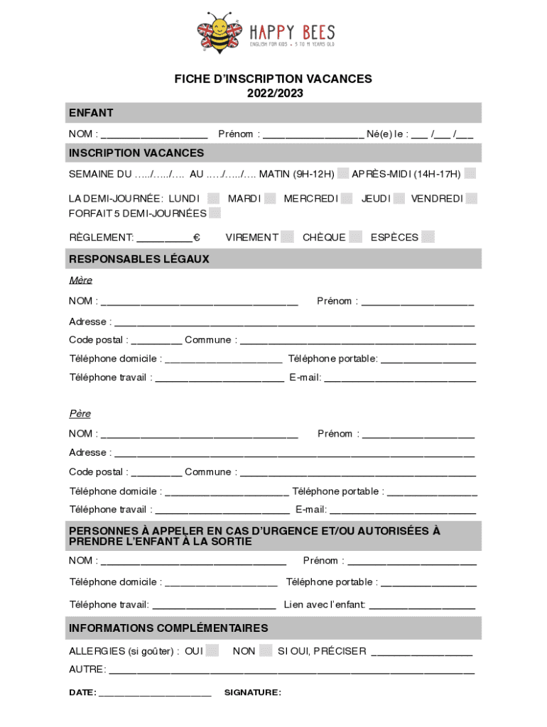 La fiche d'inscription vacances doit être déposée par les parents ou les tuteurs légaux des enfants concernés.