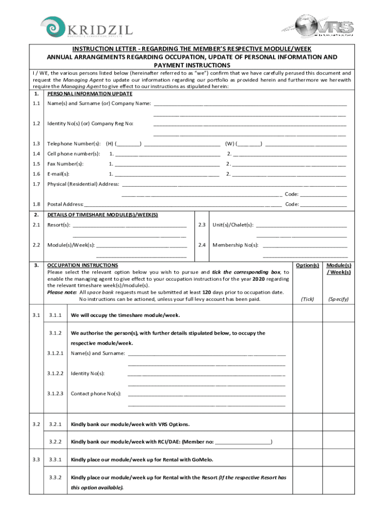 INSTRUCTION LETTER REGARDING THE MEMBERS RESPECTIVE MODULE/WEEK ANNUAL ARRANGEMENTS REGARDING OCCUPATION, UPDATE OF PERSONAL INFORMATION AND PAYMENT INSTRUCTIONS I / WE, the various persons listed
